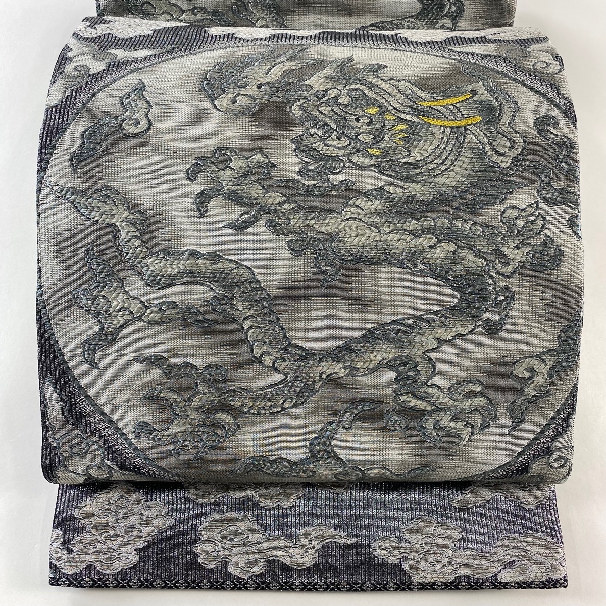- 【美品】 袋帯 逸品 落款 関西仕立て 紗綾織 煌金糸 龍 雲文 金銀糸 箔 墨色 六通 正絹 【中古】