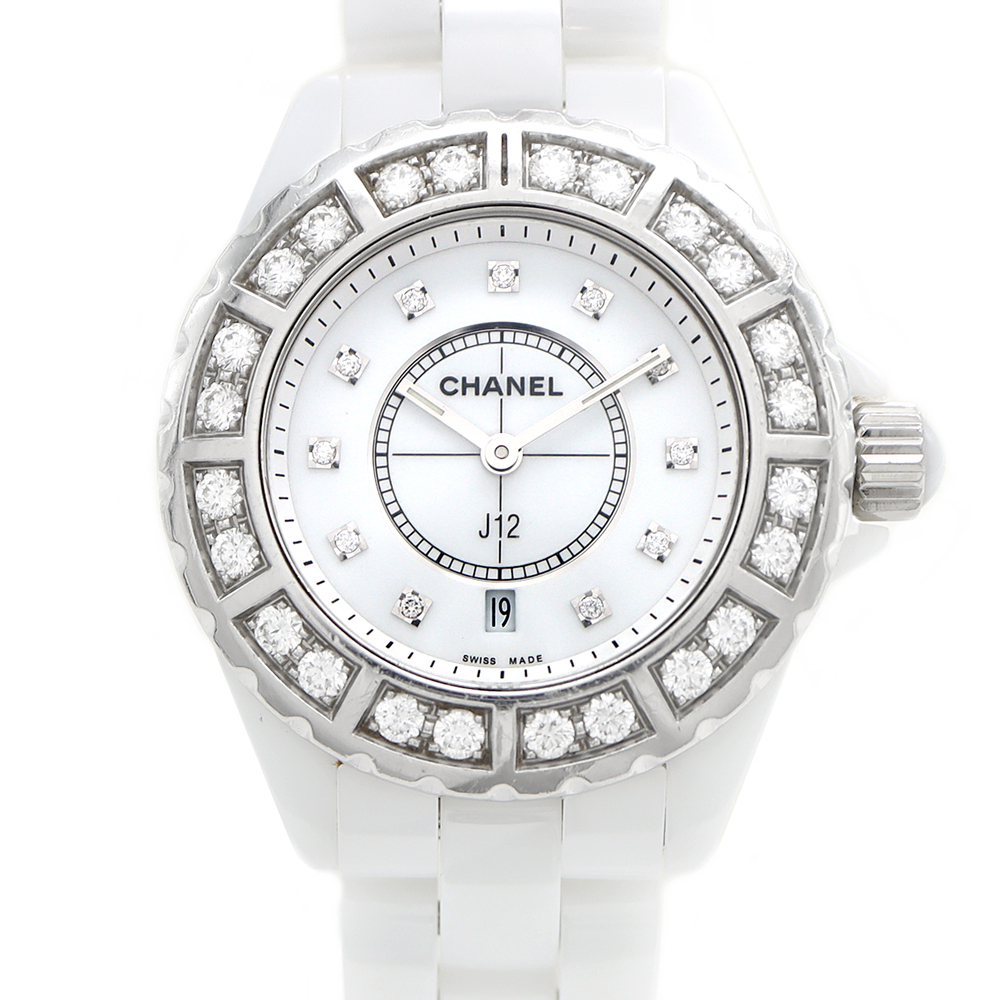 > 電池交換済 CHANEL シャネル J12 ダイヤベゼル H2429 11Pダイヤ 純正ダイヤモンド 200m防水 デイト 白 レディース クォーツ