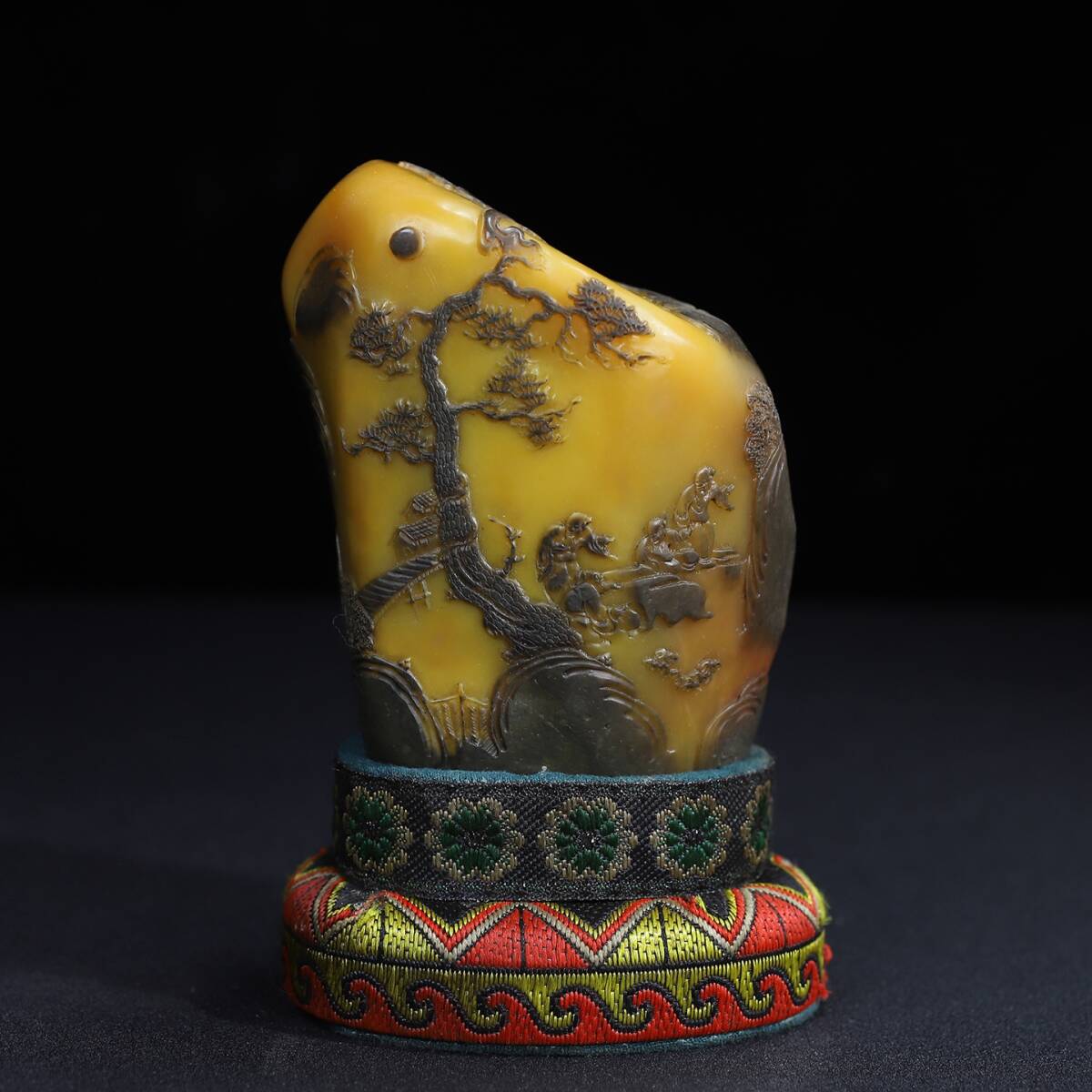 > 旧蔵 【清代篆刻家 鄧石如 号:古浣子】寿山石 烏鴉皮 彫刻 松下聚賢 山水人物紋 薄意 置物 天然石 手彫 篆刻 極細工 中国古玩 骨董品 210