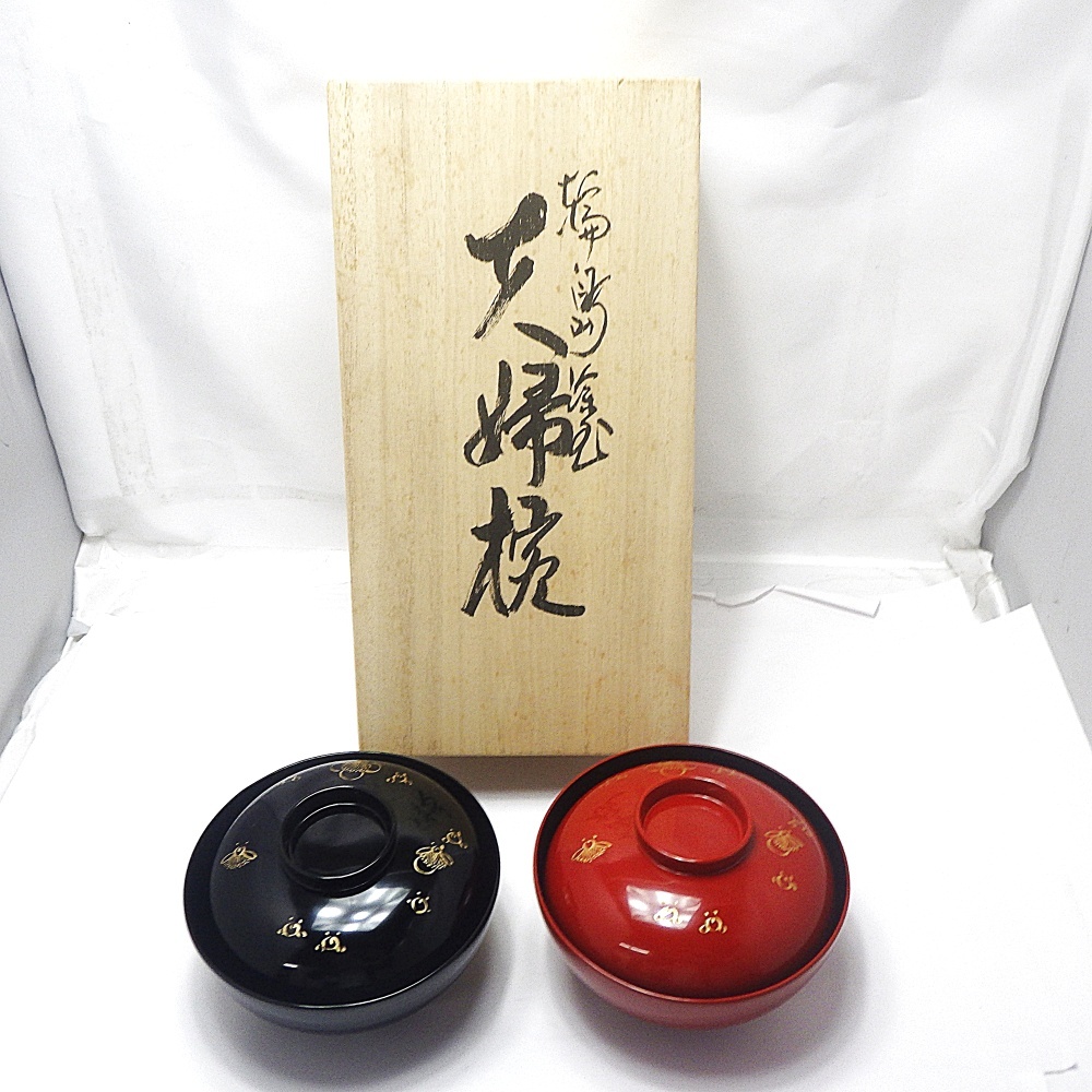 - B25-741 輪島塗 新本錦川堂 夫婦椀 蓋付 吸物椀 汁椀 蒔絵 黒塗 朱塗 塗物 漆芸 漆器 梅 花 和食器 伝統工芸 共箱/栞付