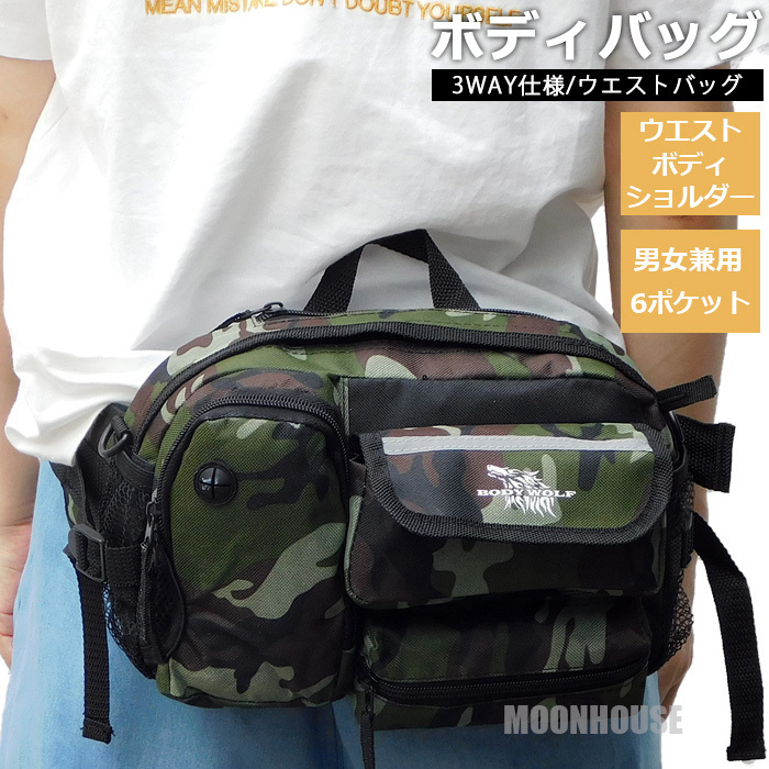 - 送料無料 3WAY マルチポケット ウエストバッグ メンズ レディース ボディバッグ ショルダーバッグ ヒップバッグ ウエストポーチ 迷彩柄□