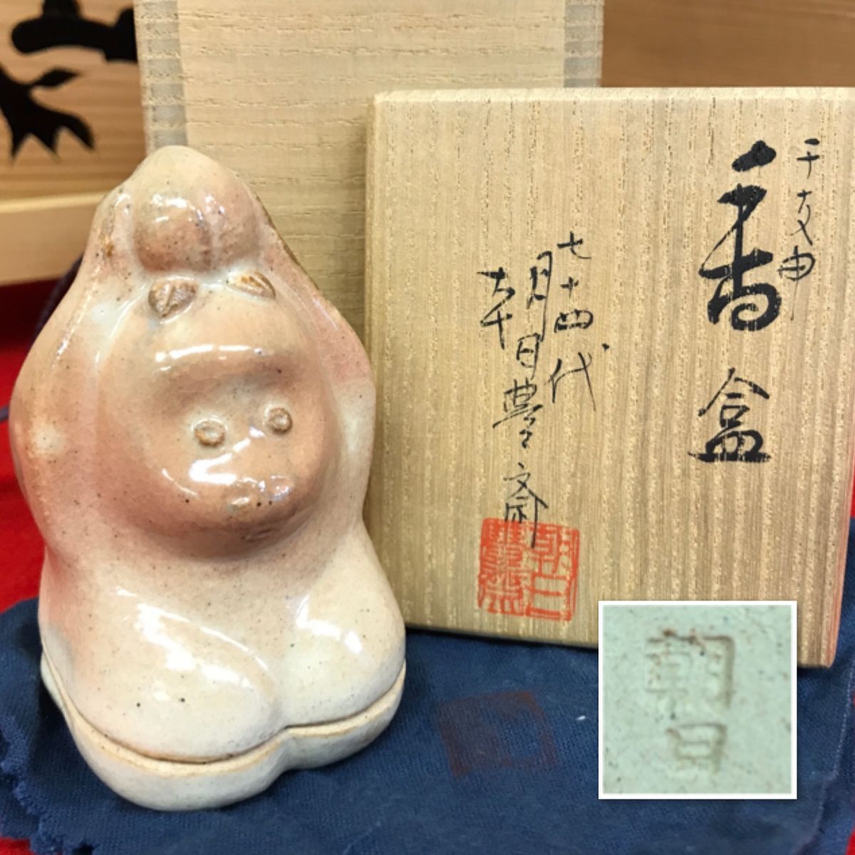 > 朝日焼 干支 申 香盒 香合 七十四代 朝日豊斎造 共布 共箱 【RA0957S#60】