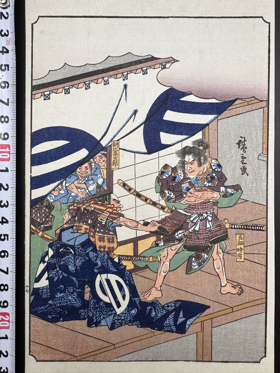 > 【真作】本物浮世絵木版画 歌川広重「曽我物語 五郎朝比奈草摺引」江戸期 武者絵 美人図 錦絵 中判 保存良い