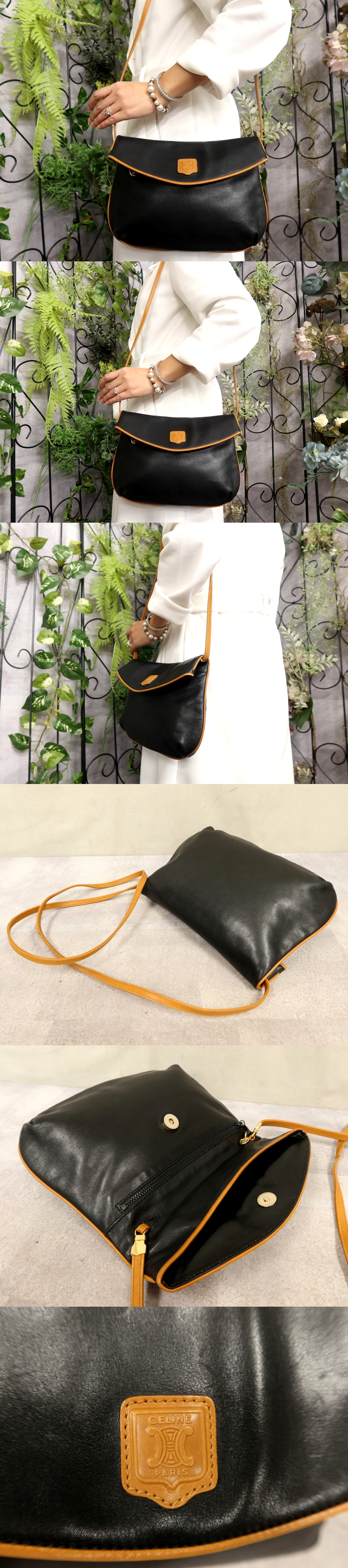 > 超美品●CELINE セリーヌ●ロゴ型押し●バイカラー●カーフ レザー 本革●ショルダー バッグ●黒 キャメル●ゴールド金具●肩掛け●Js61763