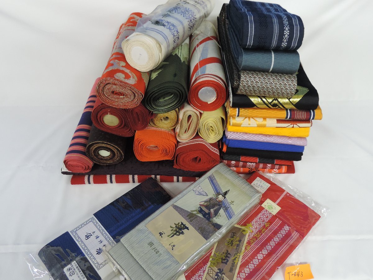 > ★T―443★着物帯大量 半幅帯など32点まとめ 正絹 ポリエステル 角型 吉弥帯(筑前博多織 米沢 ひとえ帯 着付け練習/リメイク材料[140]
