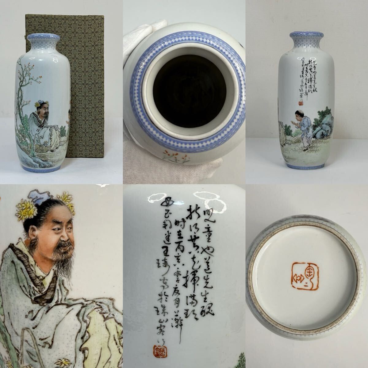 > X-中国古美術 時代物 花器 色絵 花入 色絵 粉彩 珠山八友 王琦 在銘 人物図 共箱付 唐物 陶磁器 中国古玩 骨董品