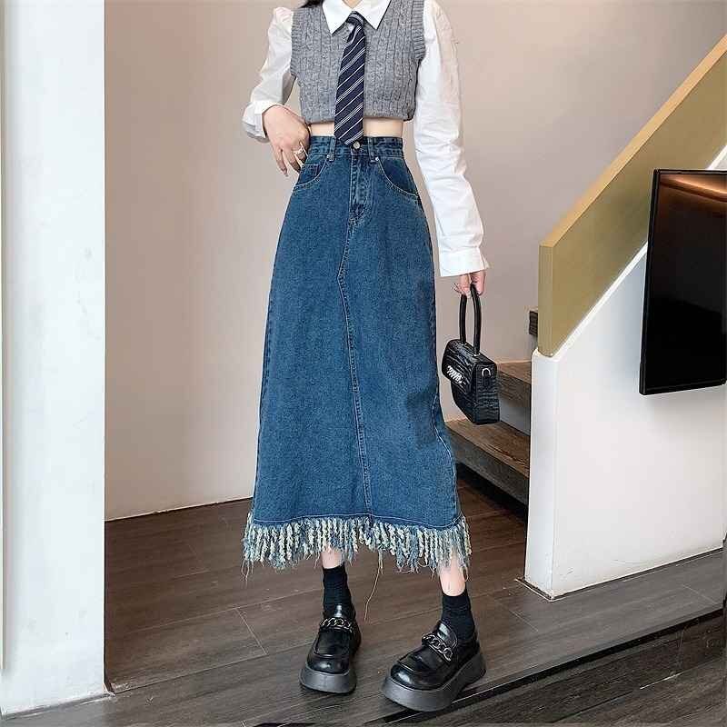 - デニムスカート フリンジ フリル ハイウエスト スリット デニム sweet系 XL ブルー