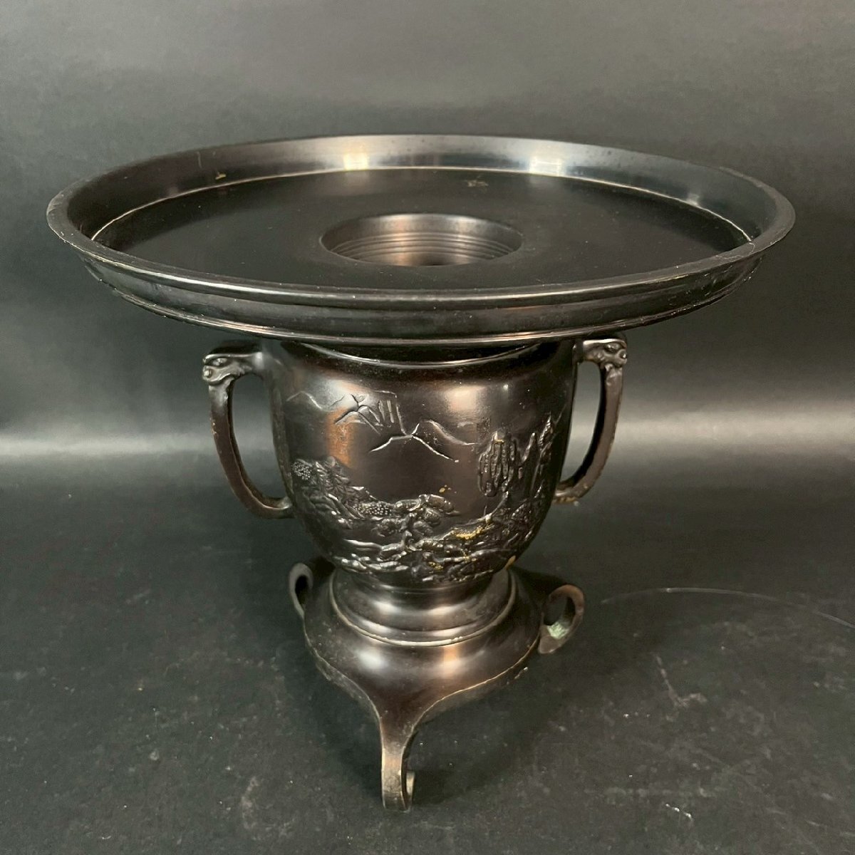 > OM0913-2‐3 薄端 うすばた 花器 茶道具 華道 銅製 銅器 金属 山水 風景 彫刻 美術 伝統 工芸品 高さ28㎝ 直径30㎝ 口径9㎝ 100サイズ