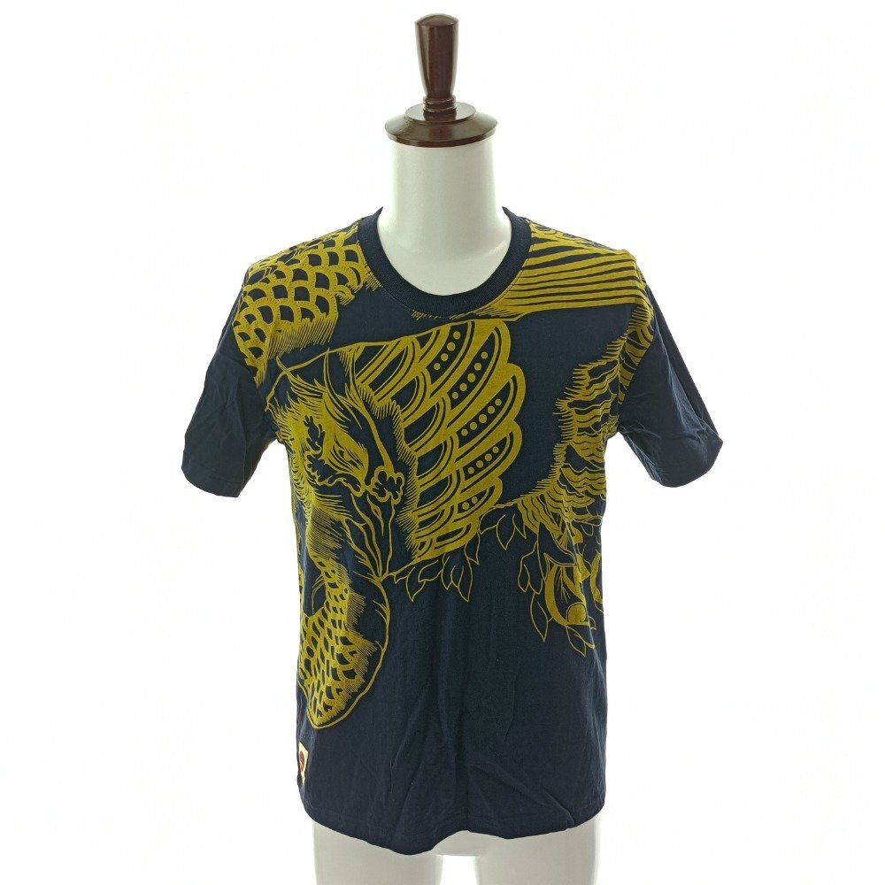 > 花旅楽団 JAPANESQUE 和柄 半袖 クルーネック Tシャツ Lサイズ ネイビー イエロー 鳳凰 丸首 メンズ カジュアル ファッション 中古