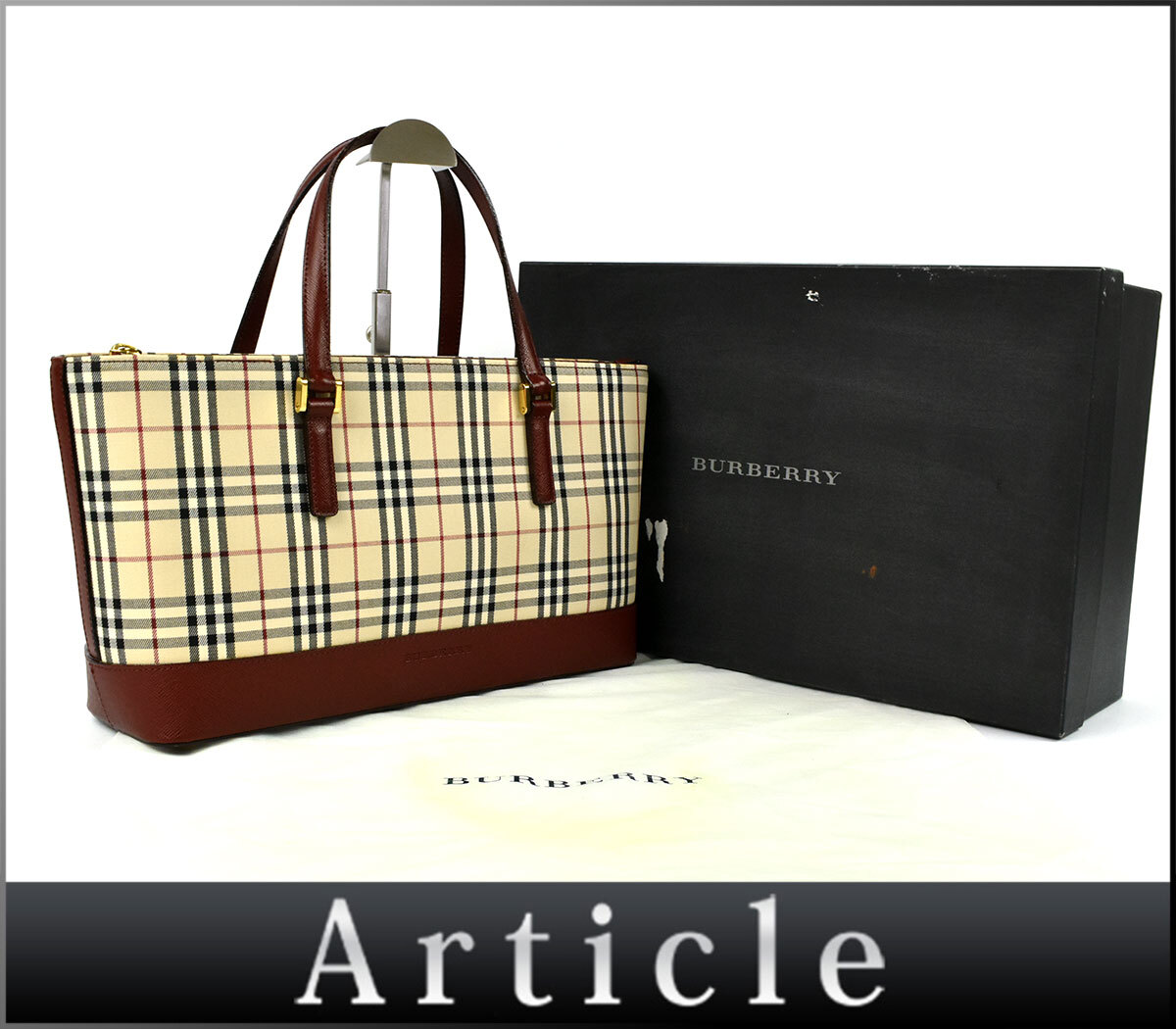 - 238738 BURBERRY バーバリー チェック柄 ハンドバッグ バッグ キャンバス レザー 革 ベージュ ボルドー 赤 レディース 箱付/ B