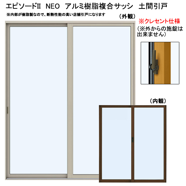 | 商品紹介 | ○ YKKAPのアルミ樹脂複合サッシ エピソードNEO 店舗引戸(引違いタイプ/複層ガラス仕様) ○ 別に出品しております、9THよりも高級なシリーズです。 複層ガラス仕様・内側が樹脂のため断熱効果が上がります。 ○ 半外付タイプ・アングル付きの仕様です。 ○ クレセント仕様です。外からは施解錠出来ませんのでご注意下さい。※外側からも施解錠希望の場合は、「召合せ錠タイプ」をご注文下さい。 * 外観色と内観色をお選び頂けます(※ピュアシルバーのみ内外同色不可です)