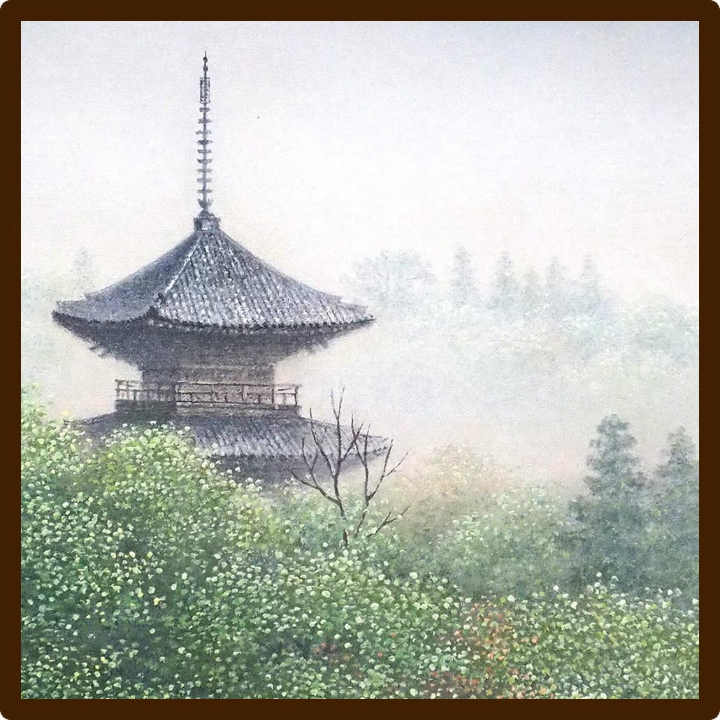- 酒井英利 「新緑の朝(真如堂)」 /キャンバスに油彩6号/1994~95年制作/京都、奈良を中心に日本の四季を描く/真作保証/ENCHANTE