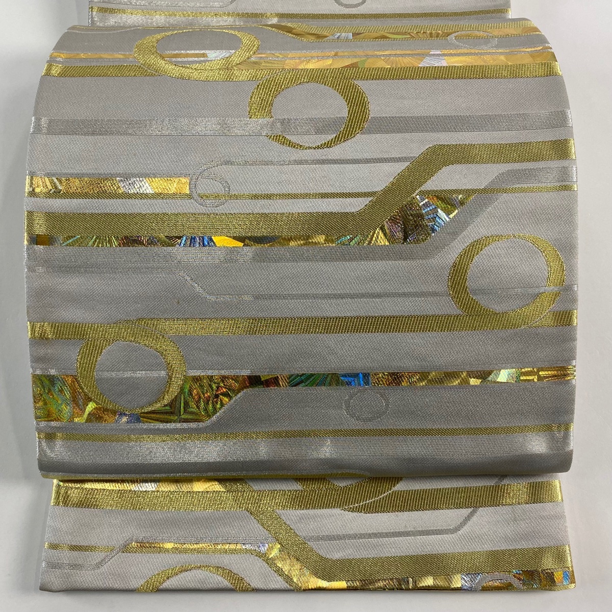 - 袋帯 名品 堀省平 落款 幾何学模様 箔 金銀糸 灰色 お太鼓柄 正絹 【中古】