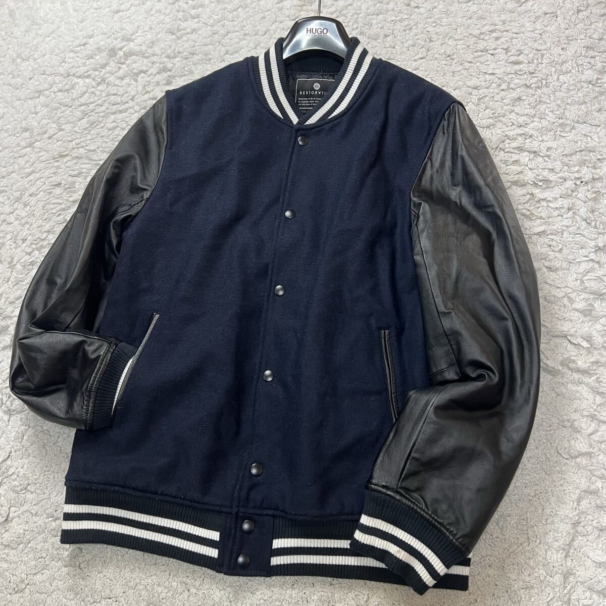 > 【極美品】RESTORATION レストレーション スタジャン 希少XL 天然本革袖切替 ネイビー×ブラック 極暖 肉厚 裏地キルティング柄