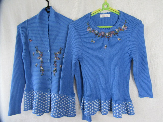 - Catolin カトリン アンサンブル 長袖ブラウス+カーディガン 馬里邑 ニット レース ビーズ フラワー刺繍 ブルー M~L