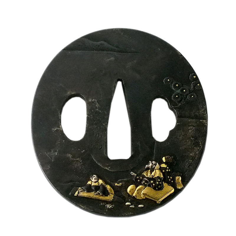 詳細:唐人物図鍔 銘茂保(花押) 特別貴重小道具認定書 サイズ:6.7cm×6.0cm(高彫象嵌 丸型) 素材:朧銀地 実重量:94.9g 付属品:桐箱、認定書(昭和48年/日本美術刀剣保存協会)