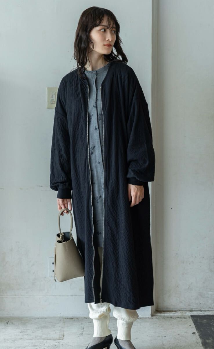 - とろける肌触り 綿100%素材 新品 タグ付き teMite シワ接結 ジップロングカーディガン ブラック 羽織り ロングブルゾン