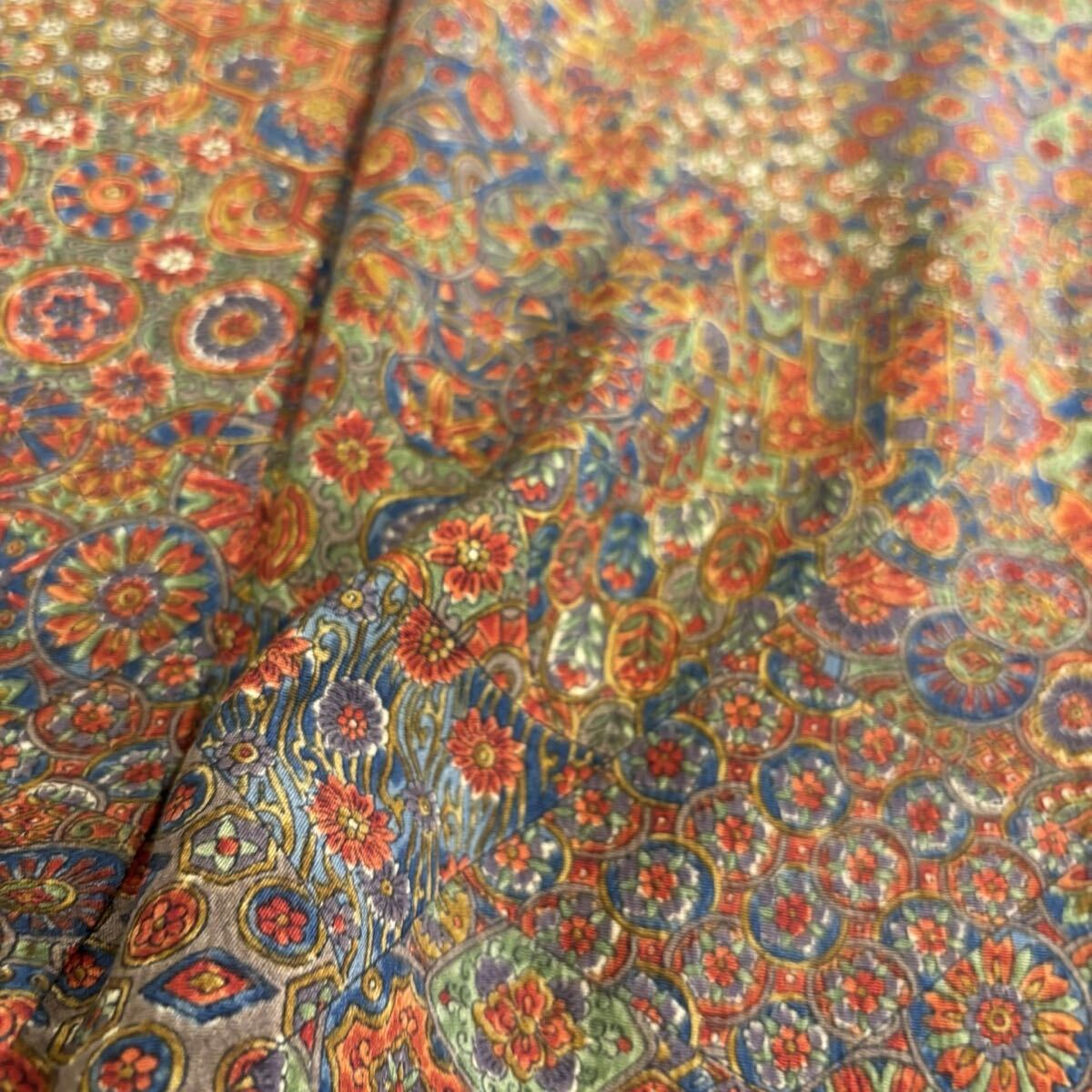 - 小紋 更紗模様 縮緬 裄66 裂取 正絹 着物 F-478