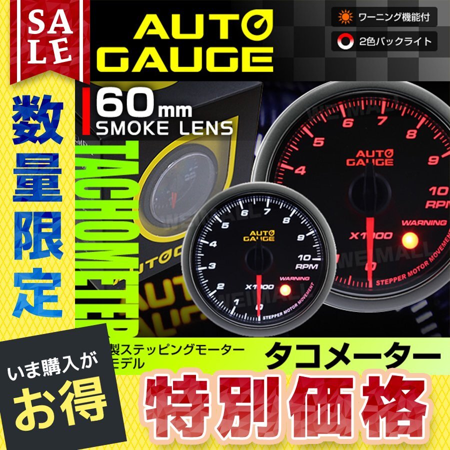 - 【数量限定】日本製モーター仕様 新オートゲージ タコメーター 60mm 追加メーター ワーニング機能 2色LED 静音 スモークレンズ [430]