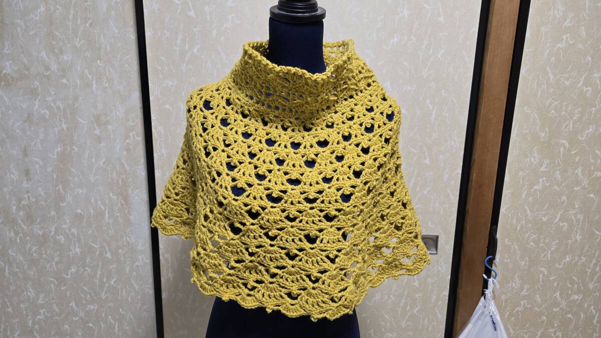 - ★秋冬物★ウール100%★手編み★タートルネック風ケープ(芥子色)♪送料無料♪