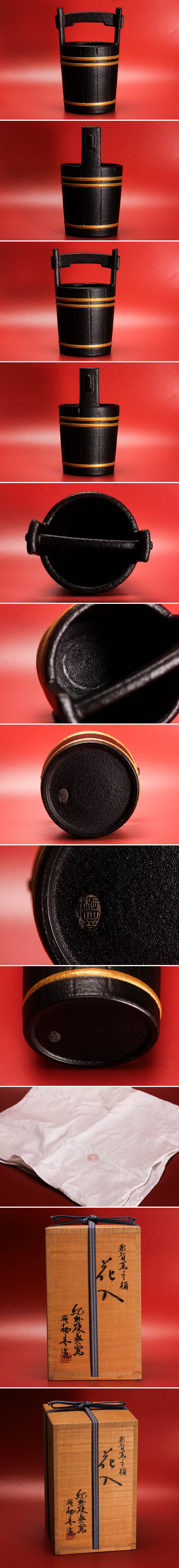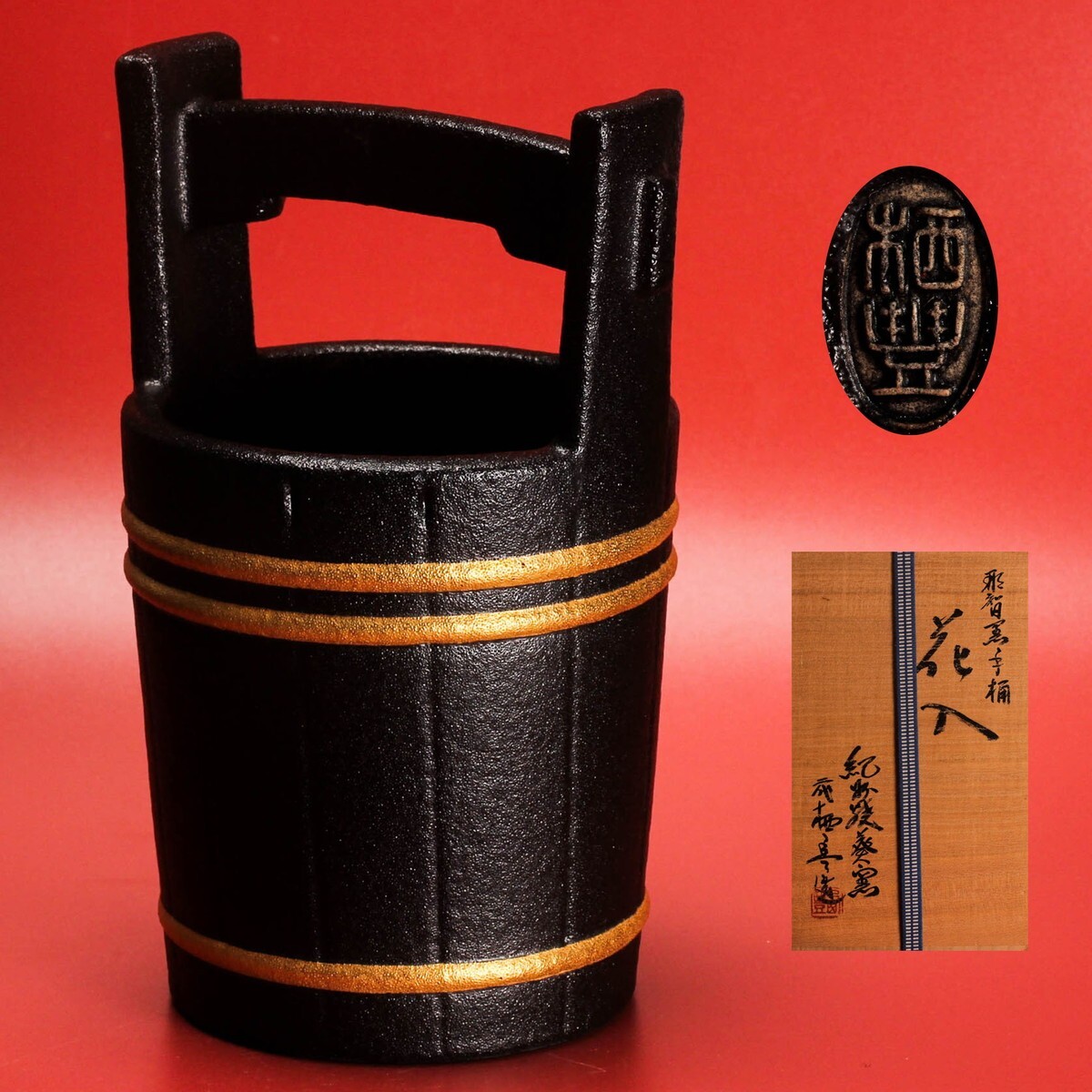- 二代 寒川栖豊 秀逸作 紀州焼 葵窯 那智黒手桶花入 共箱 共布 本物保証