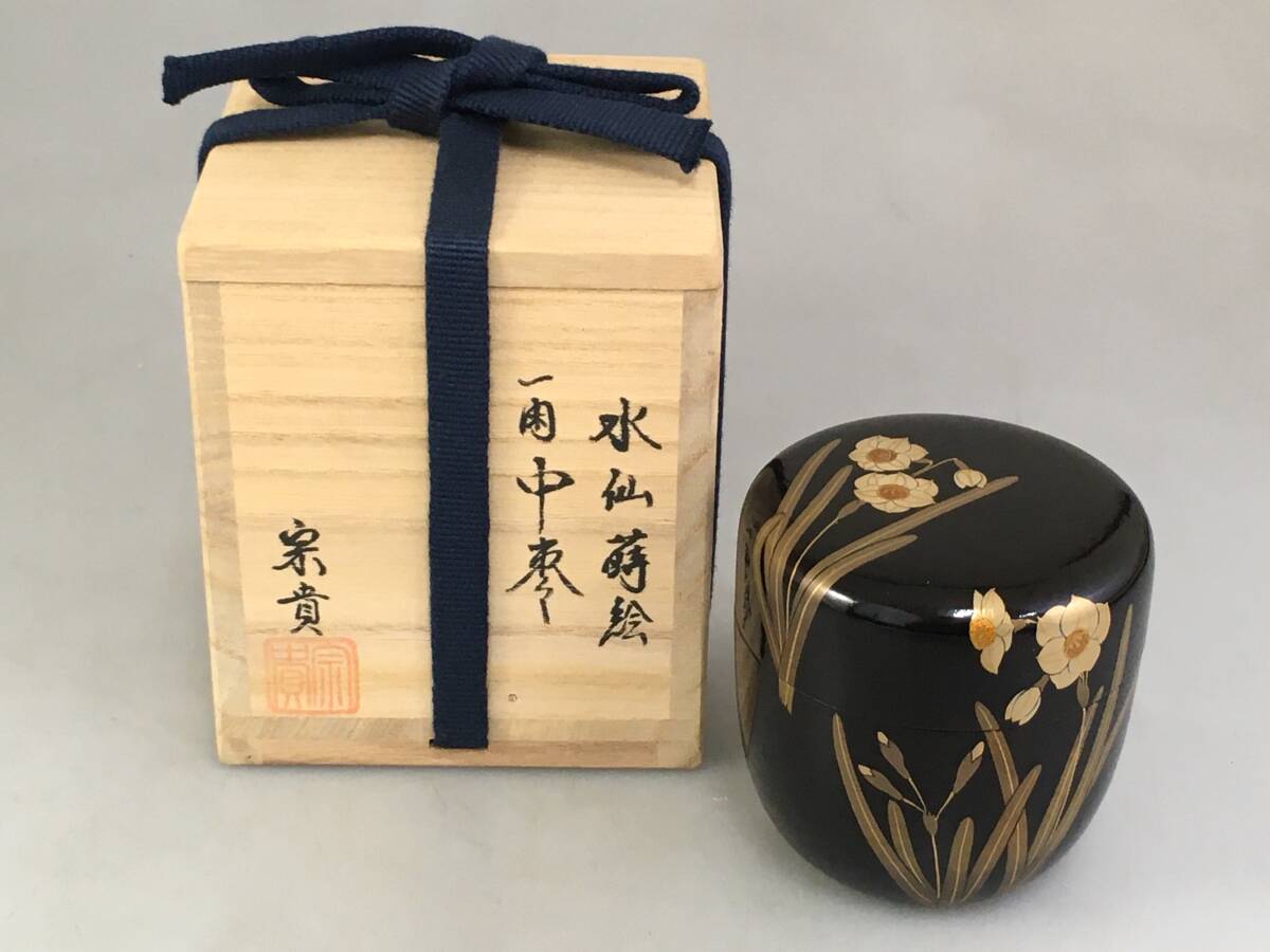 輪島塗 蒔絵師 北浜宗貴 作 水仙蒔絵 一閑 中棗 茶入 茶道具 共箱付
