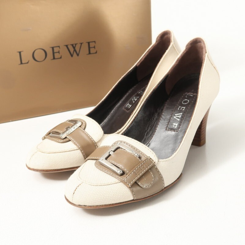 > GS4400△イタリア製 LOEWE ロエベ キャンバス×レザー バックルパンプス 靴 アイボリー系 サイズ35.5/22.5cm相当 箱付き