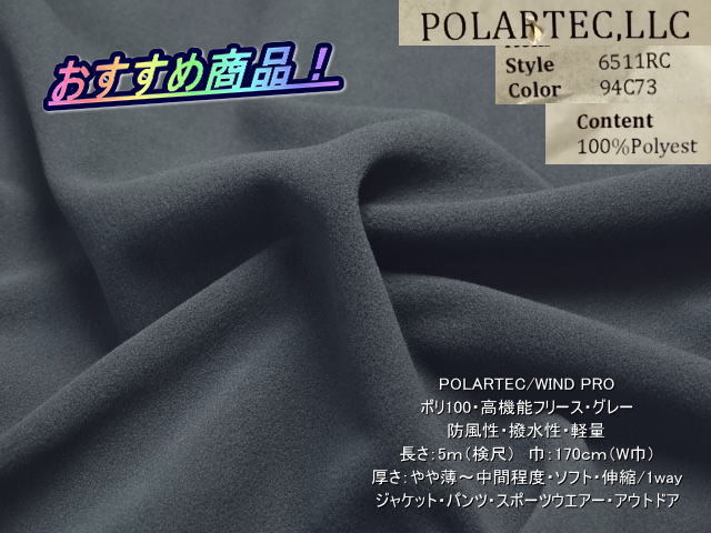 - 最終!POLARTEC WIND PRO 高機能フリース 撥水 グレー 4.7mW巾