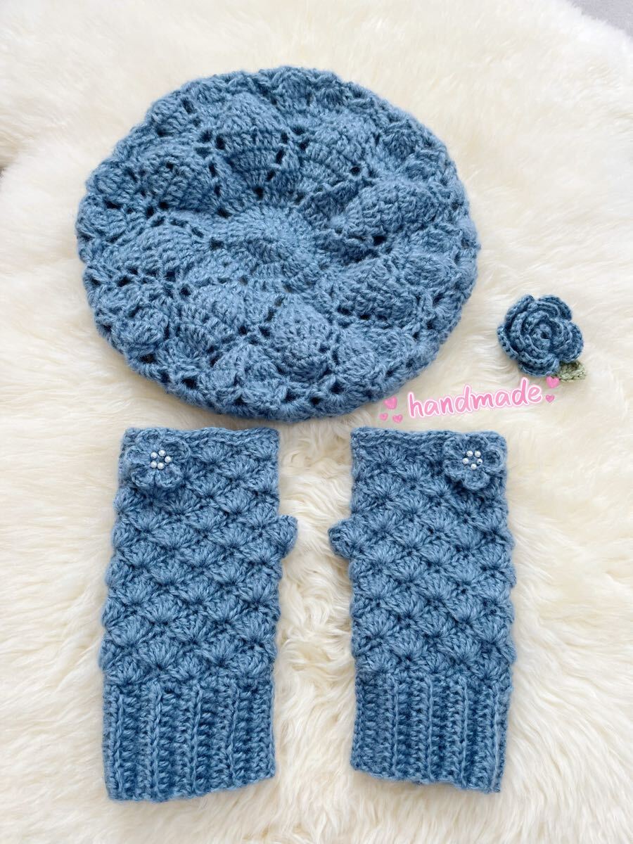 - ** ハンドメイド ** ベレー帽セット 手作り帽子 かぎ針編みブローチ 手作り手袋 3点セット 102803