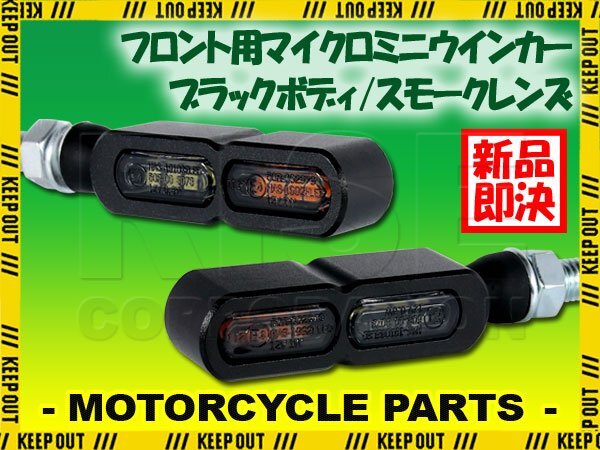 - デイライト付 マイクロミニウインカー ダブル フロント用 LED 車検対応 ブラック スモーク レンズ 12V 汎用 アルミ製 左右セット バイク