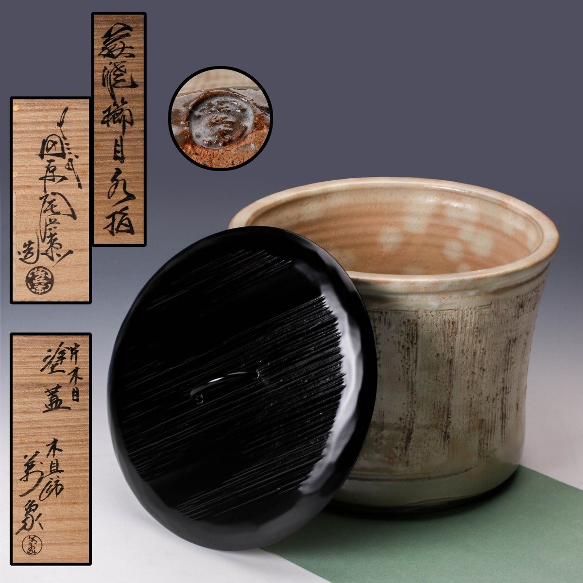 - 【佳香】十二代 田原陶兵衛 萩焼櫛目水指 三代橋村萬象塗蓋 共布 栞 茶道具 本物保証