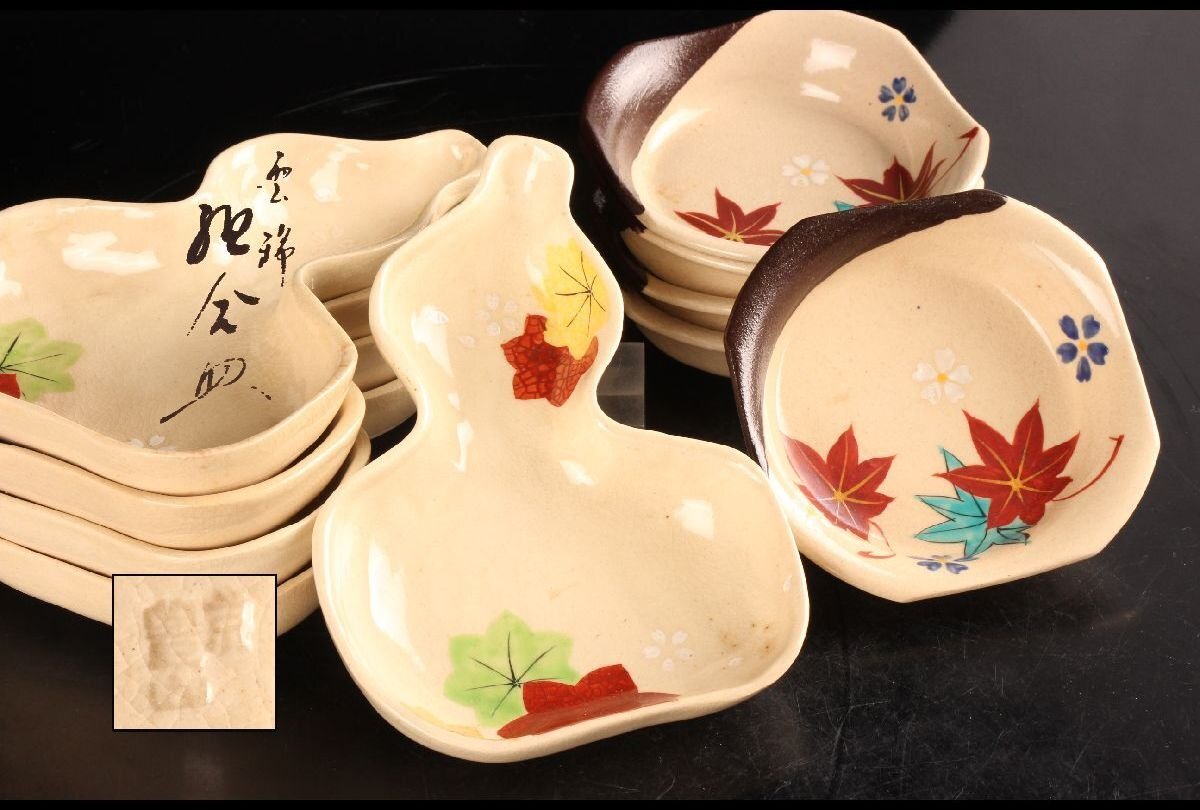 > [URA]平安萬珠堂/雲錦紅葉絵盆皿10客/共箱/10-10-187 (検索)骨董/皿/和皿食器/向付/小皿/中皿/割烹/瓢箪形皿/隅切皿