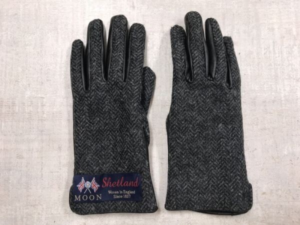 - 英国イングランド製生地 ムーン MOON ヘリンボーン ツイード レトロ トラッド ブリティッシュ レザー切替 グローブ 手袋 レディース グレー