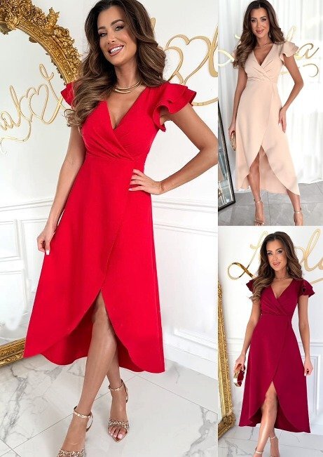 - ロングワンピース フリル袖 半袖 Vネック 無地 ドレス パーティー 二次会 披露宴 懇親会 L ブラック