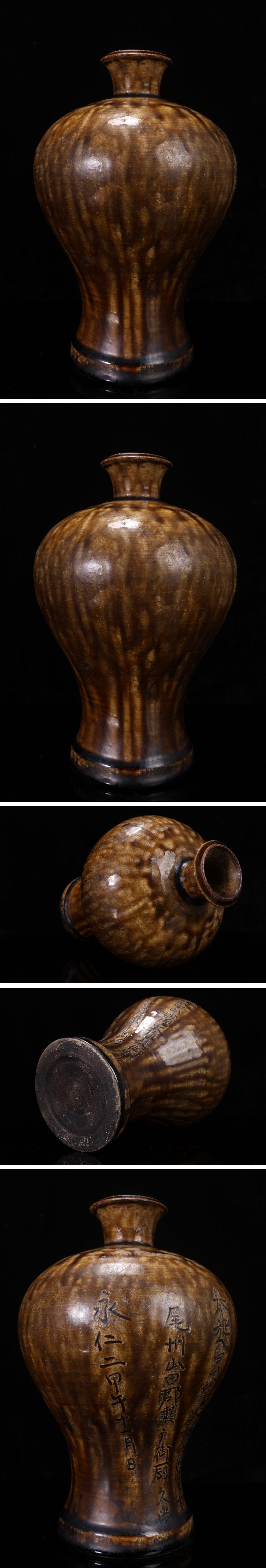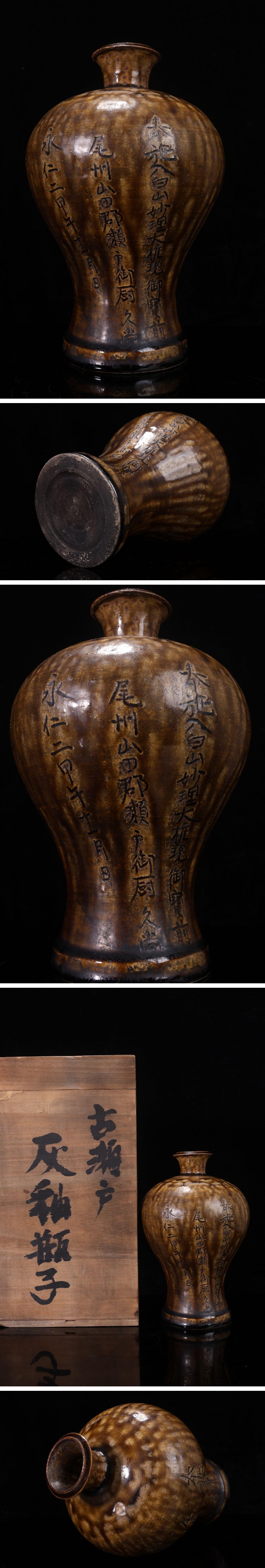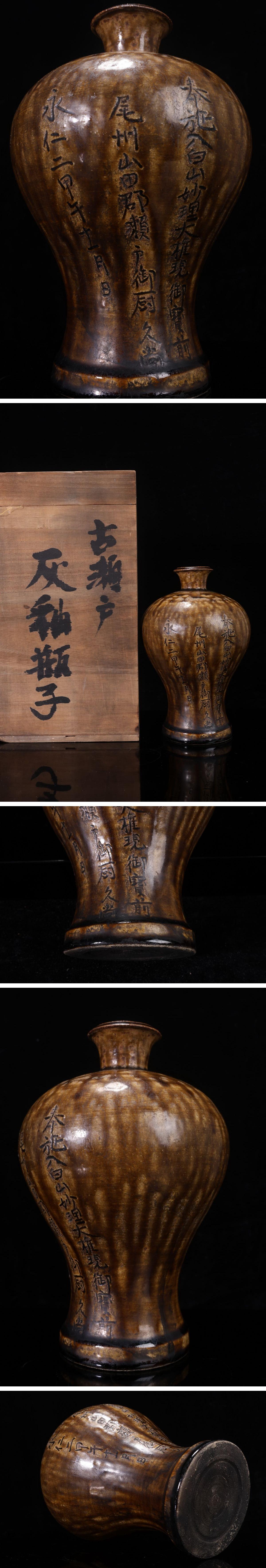 - 【珍品堂】1円から P89-V01 瀬戸焼 古瀬戸 加藤唐九郎 作 在銘 永仁 灰釉 染付 瓶子 高23cm 共箱 一輪挿し 飾壺 花入 木箱 伝統工芸置物 骨