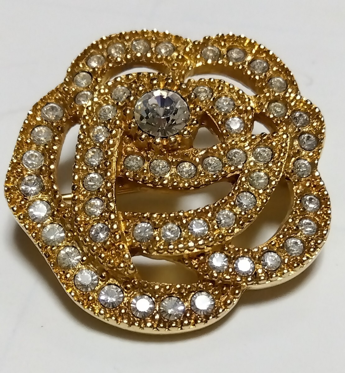 > ◯Christian Dior ディオール 薔薇 バラ フラワー モチーフ ゴールド(カラー) × ラインストーン ピンブローチ