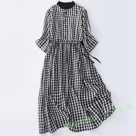 > ☆新品 レディース ゆったり大きいサイズ体型カバー 綿麻 チェック柄切り替え半袖ロングワンピース M~2XL黒白