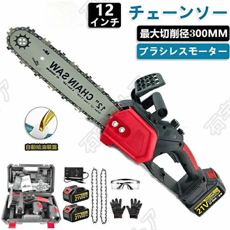 - チェーンソー 12インチ マキタ バッテリー互換対応 バッテリー2個付 ブラシレスモーター 電動ノコギリ 給油可能 枝切り 家庭用 shw0017