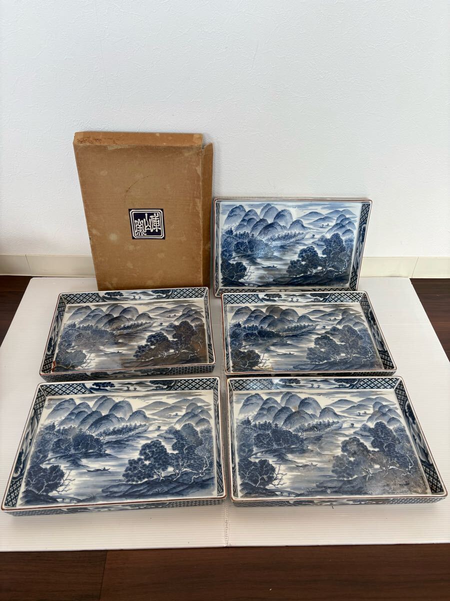 - 未使用 庫山窯 染付山水長角盛皿5枚 長方皿 角皿 大皿 料理屋 料亭 五客 昭和レトロ