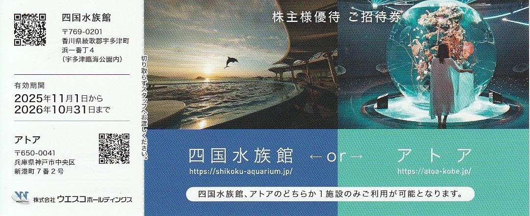- 【最新】即発送 ウエスコホールディングス 株主優待 四国水族館/アトア 入場券 ~2026/10/31