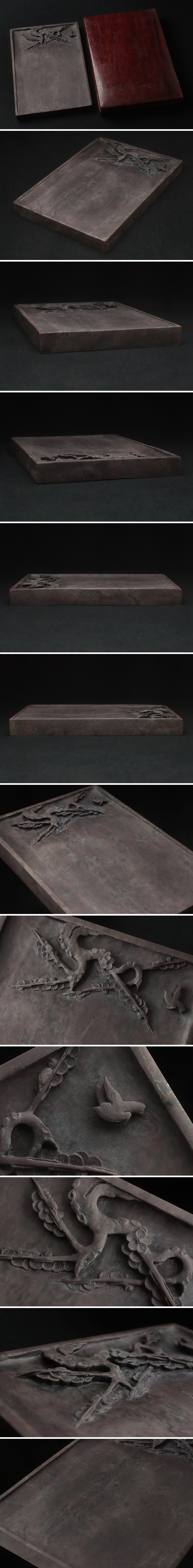 - FB223 中国書道具 端渓硯・端硯 縦24.7cm 重2.4kg 唐木硯入・端石雕梅鳥圖長方硯・唐硯・古硯 中国古玩 文房四宝