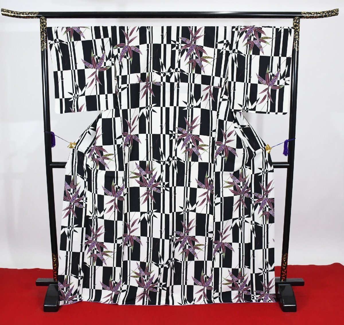 > 小紋 着物 袷 白黒 市松柄 竹 身丈166cm 裄丈69cm ★ kb-7403 桜庭呉服店