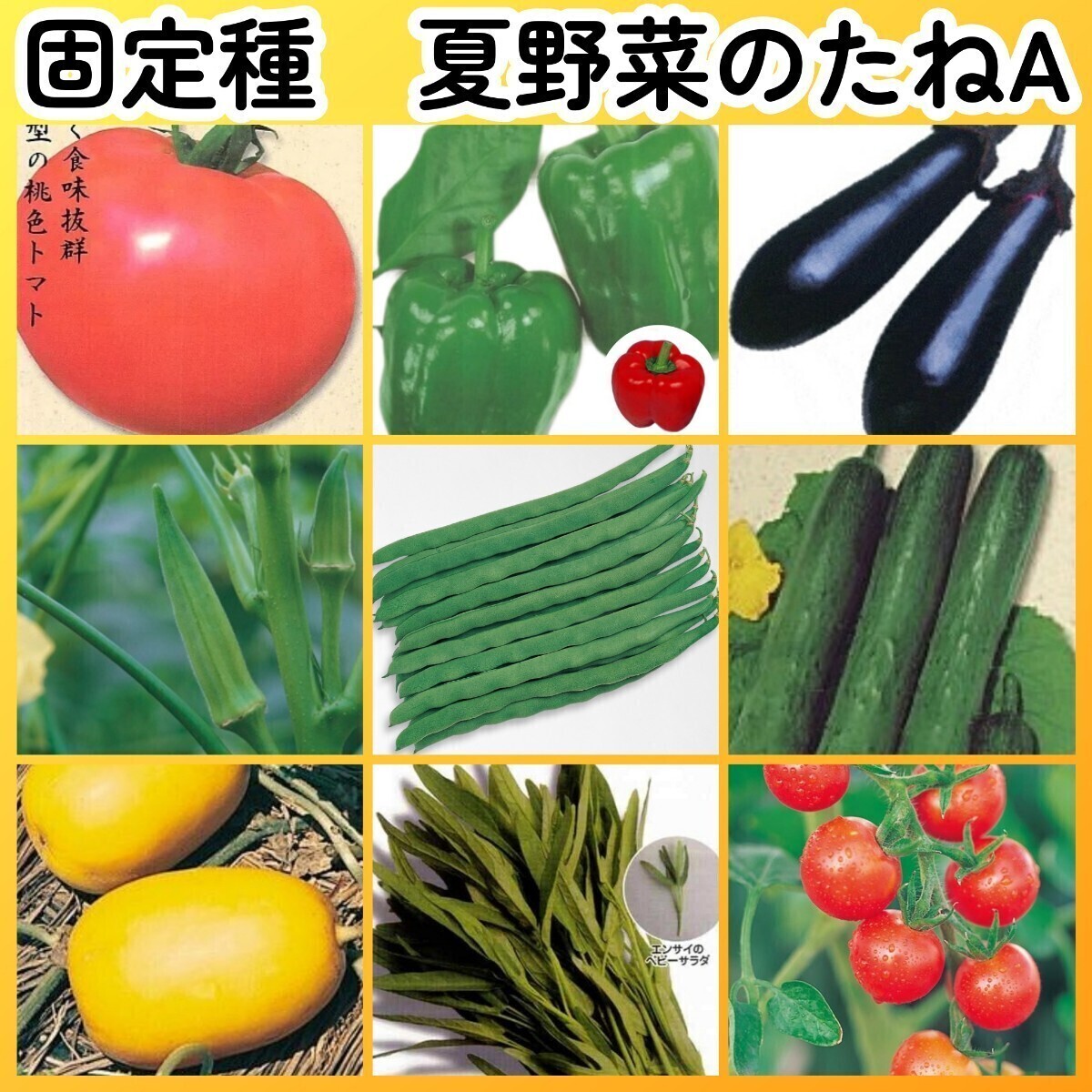 - 匿名配送無料◆固定種夏野菜の種A◆大玉トマト+ピーマン+ナス+オクラ+つるありインゲン+キュウリ+マクワウリ+空芯菜エンサイ+ミニトマト