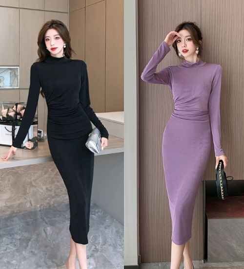 - 長袖ワンピース ひざ丈 タイトワンピ きれいめ 無地 カジュアル 秋冬 S パープル