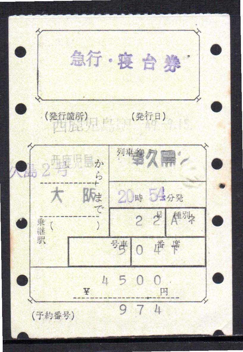 - 国鉄 マルス券 屋久島2号 急行券・寝台券 西鹿児島から大阪 初期 縦型