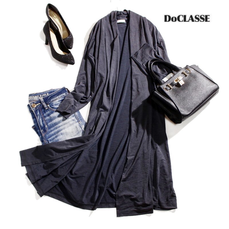 > 美品 DoCLASSE ドゥクラッセ シンプル ジャージ― ミセス ロングカーディガン グレー Lサイズ ボタンなし 羽織り オーガンジー ほんのり艶