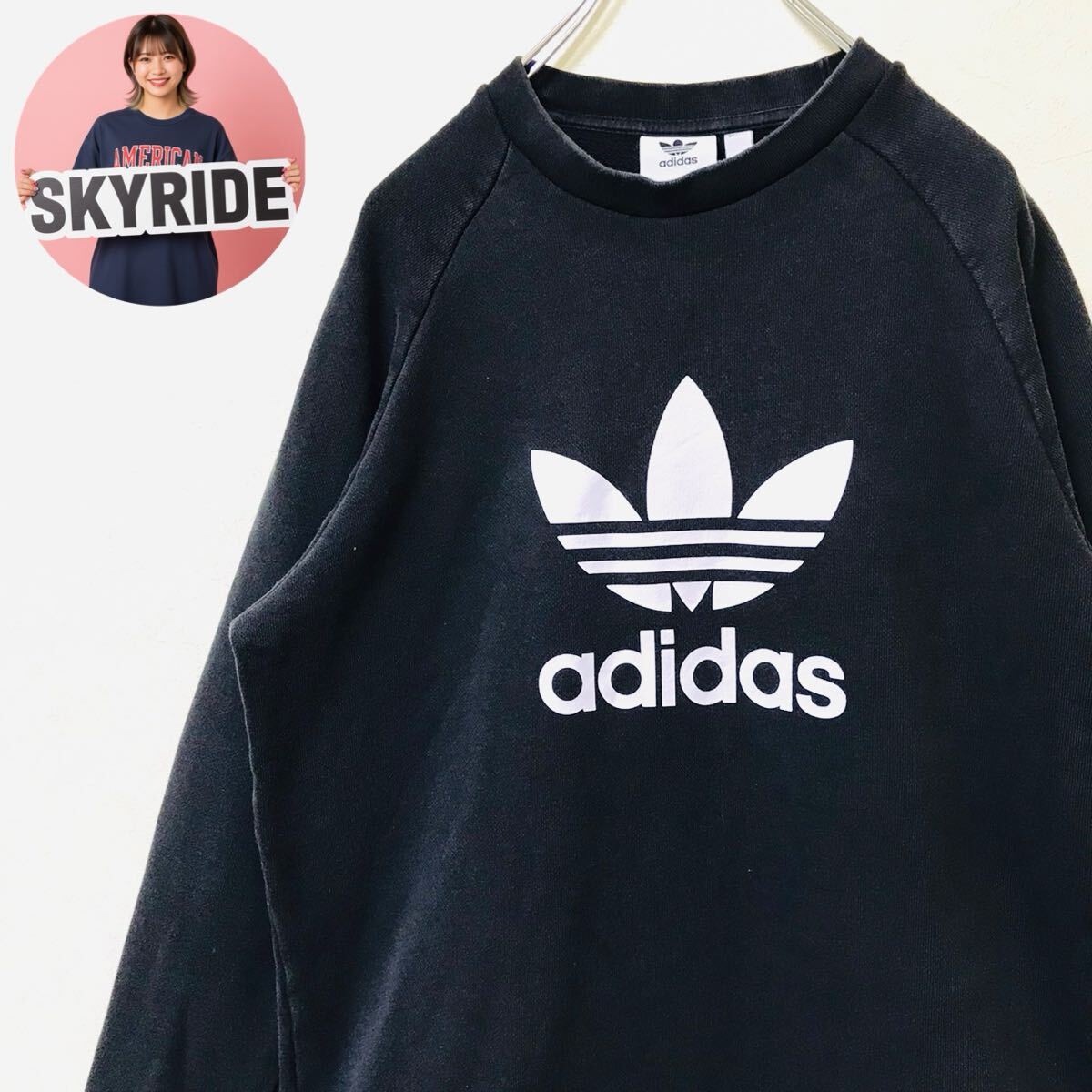 > Y2K adidas アディダス スウェット トレーナー トレフォイルロゴ ビッグプリント M ブラック コットン混 ストリート系 通年着用可 #TT0398