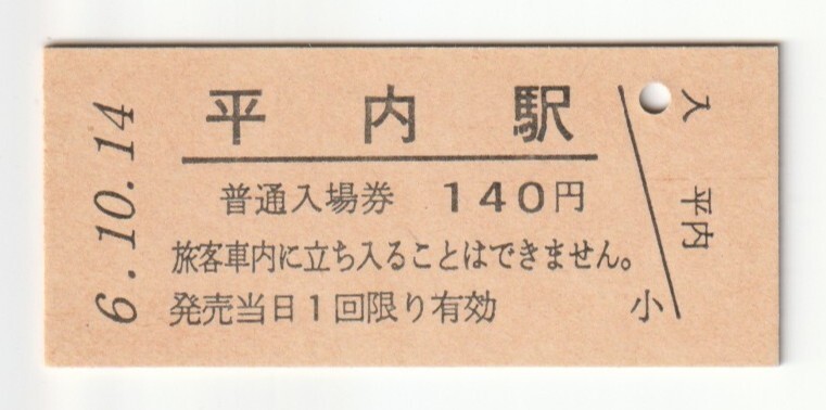 - 平成6年10月14日 八戸線 平内駅 140円硬券普通入場券(日付印刷)