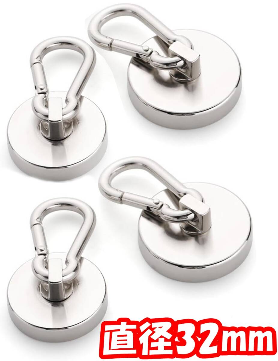 - 【4個-直径32mm】カラビナ付き磁石 超強力磁石 マグネットフック ネオジム磁石 ステンレス製 防錆