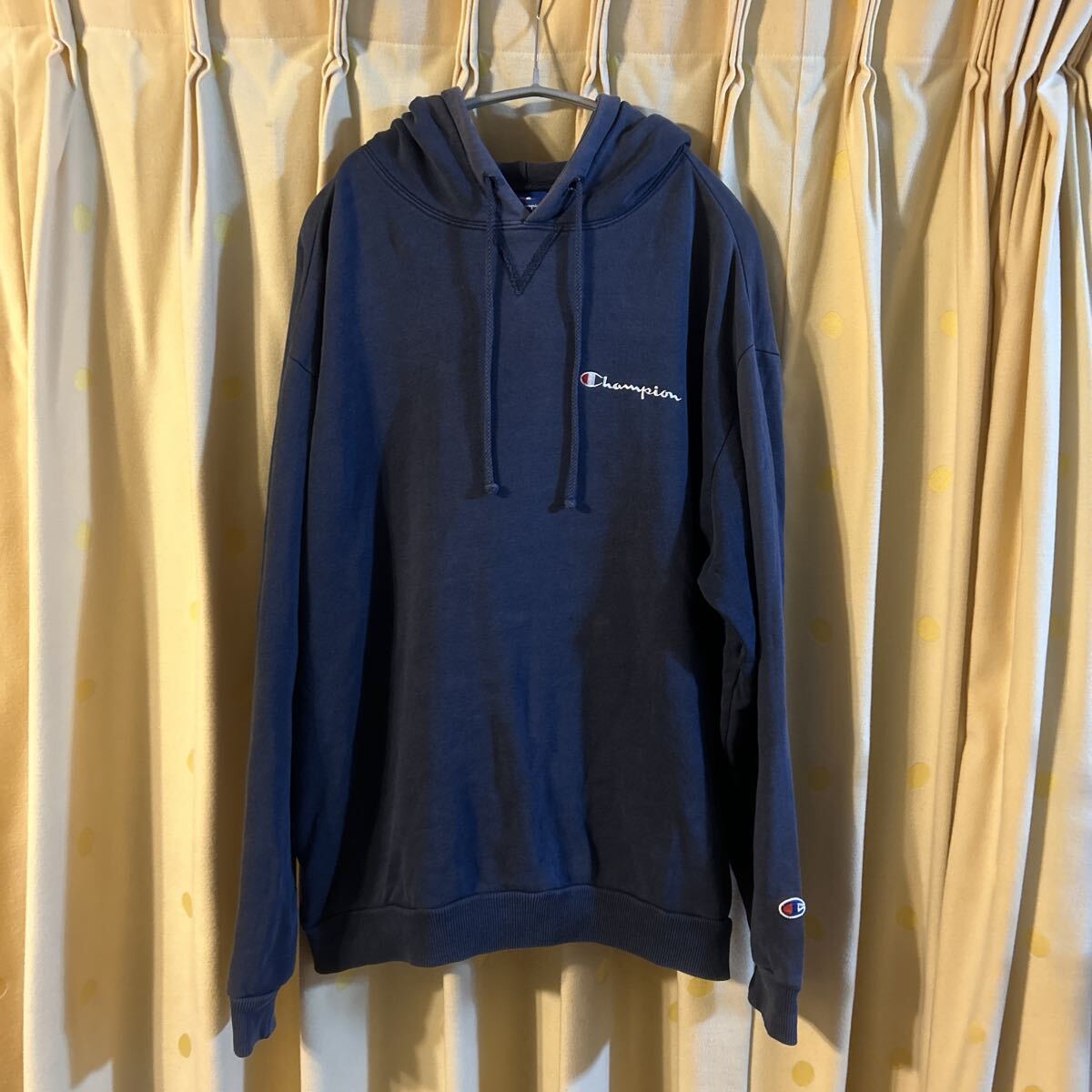 > 90S 刺繍ロゴ フェード ナス紺 Champion チャンピオン プルオーバーパーカー 前V サイズL